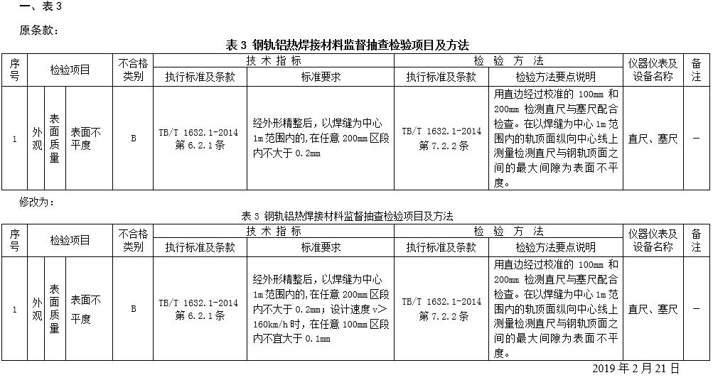 《鋼軌鋁熱焊接材料-鐵路專用產品質量監督抽查檢驗實施細則》(GTCC-076-2018)更正內容