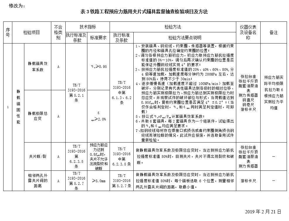 《鐵路工程預(yù)應(yīng)力筋用夾片式錨具-鐵路專用產(chǎn)品質(zhì)量監(jiān)督抽查檢驗(yàn)實(shí)施細(xì)則》(GTCC-073-2018)更正內(nèi)容