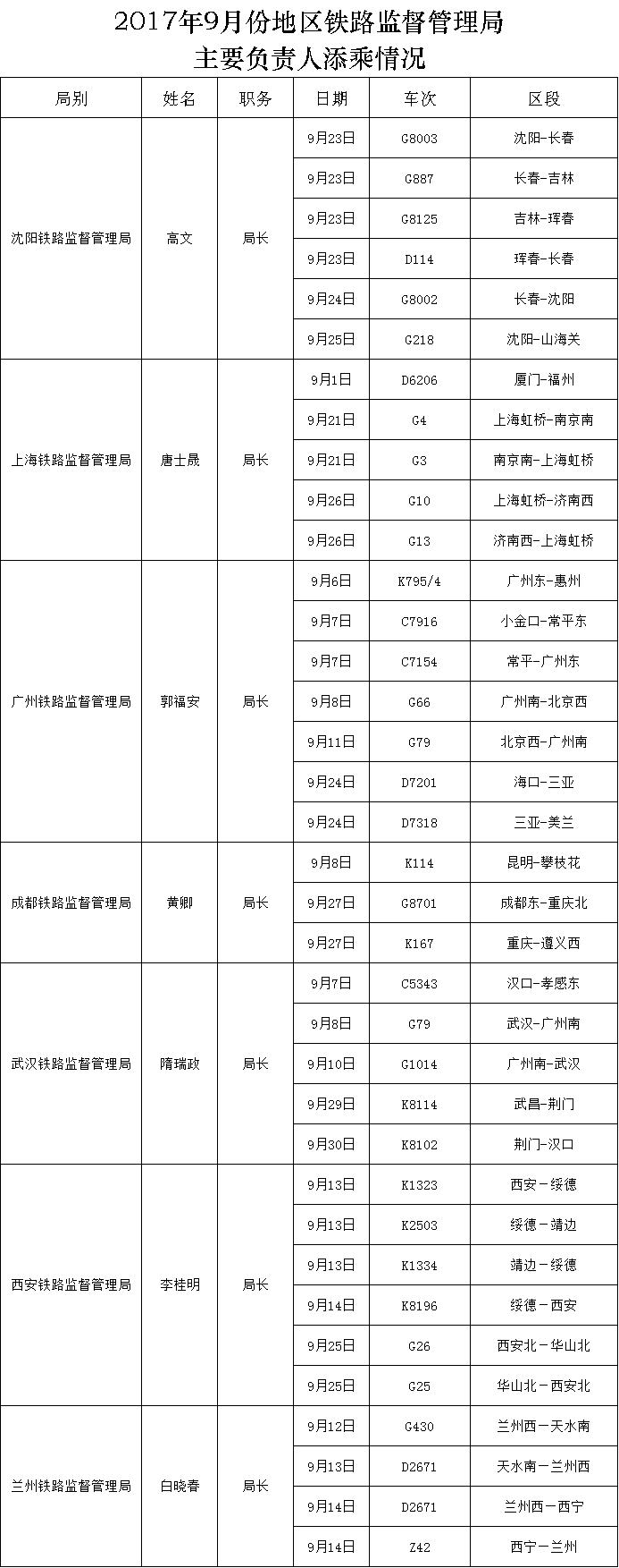 上一篇:2017年9月份國家鐵路局機關各部門主要負責人添乘情況