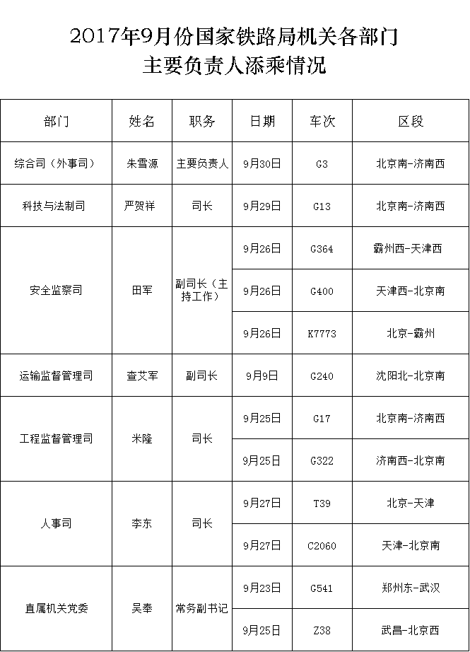 下一篇:2017年9月份國(guó)家鐵路局機(jī)關(guān)各部門主要負(fù)責(zé)人添乘情況