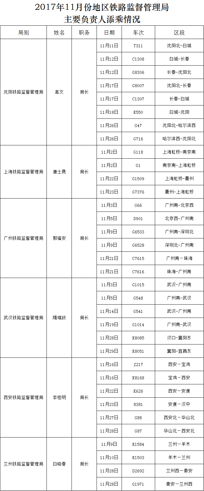 2017年11月份地區鐵路監督管理局主要負責人添乘情況