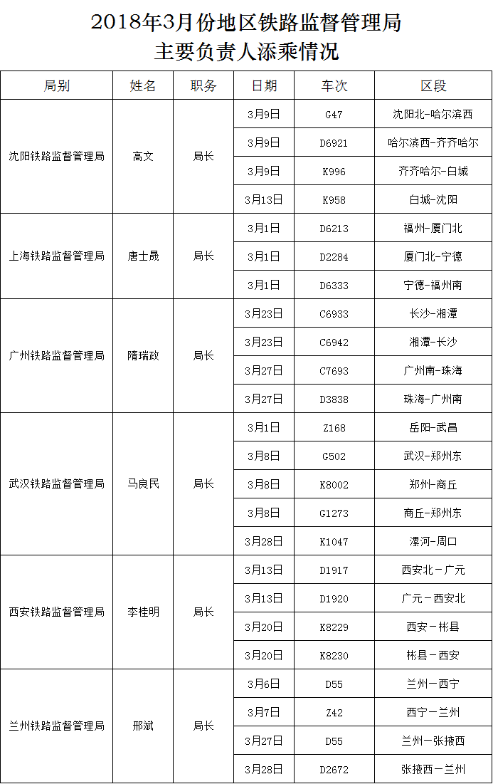 2018年3月份地區鐵路監督管理局主要負責人添乘情況
