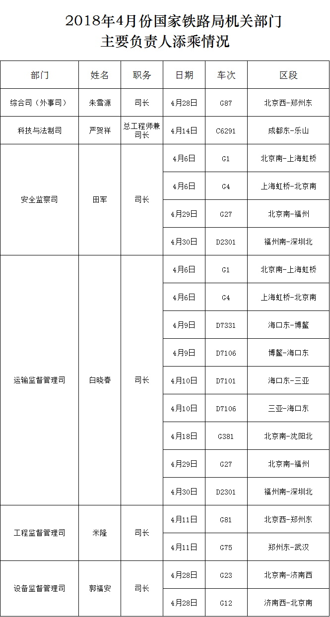 2018年4月份國家鐵路局機關部門主要負責人添乘情況