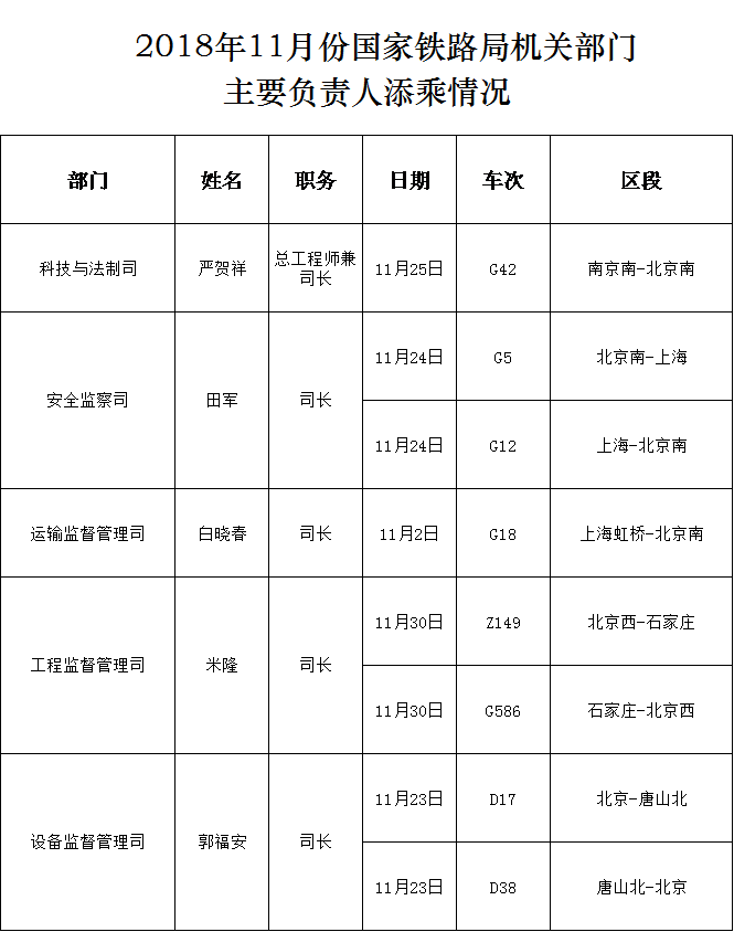 下一篇:2018年11月份國家鐵路局機關部門主要負責人添乘情況