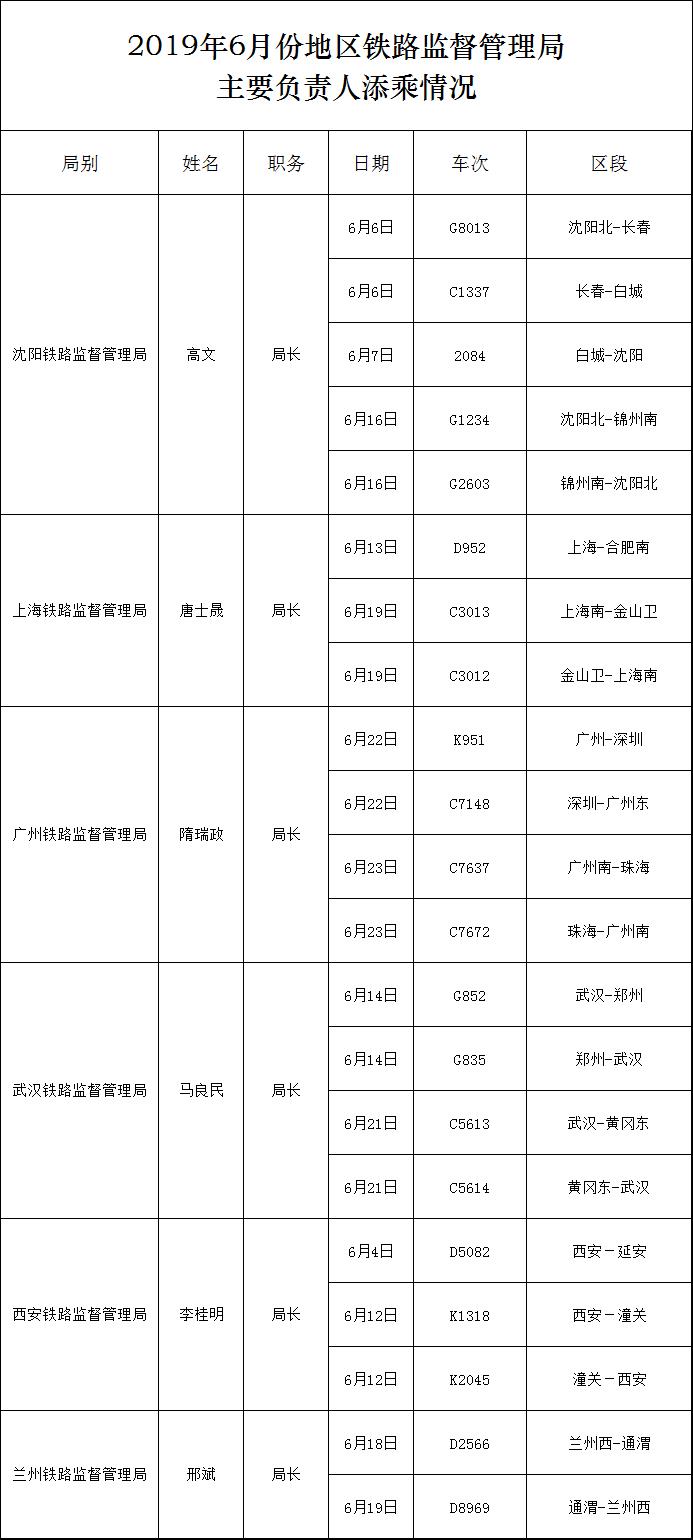 2019年6月份地區鐵路監督管理局主要負責人添乘情況