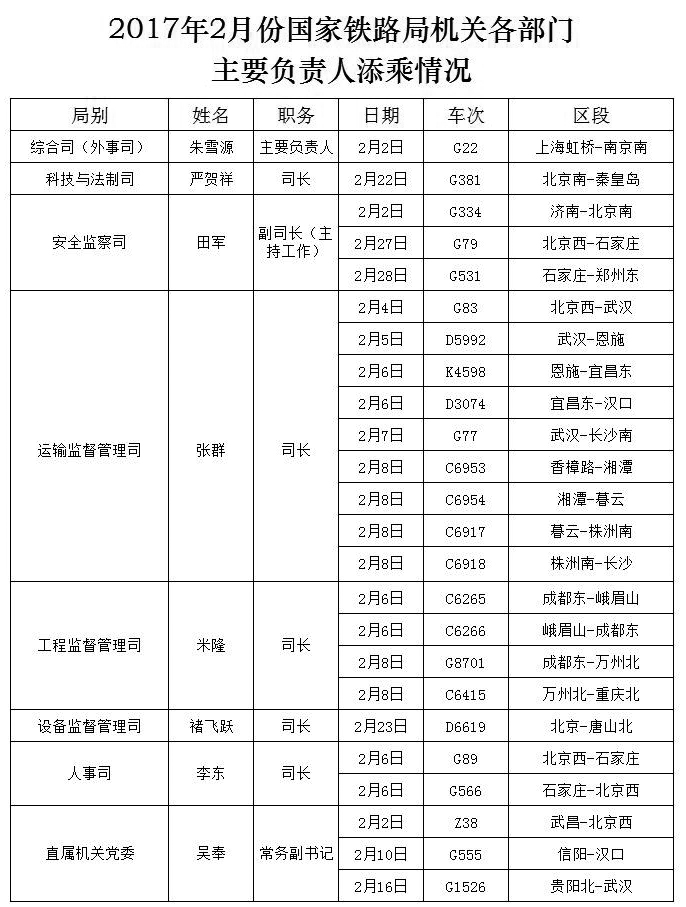 上一篇:2017年2月份國家鐵路局機關各部門主要負責人添乘情況