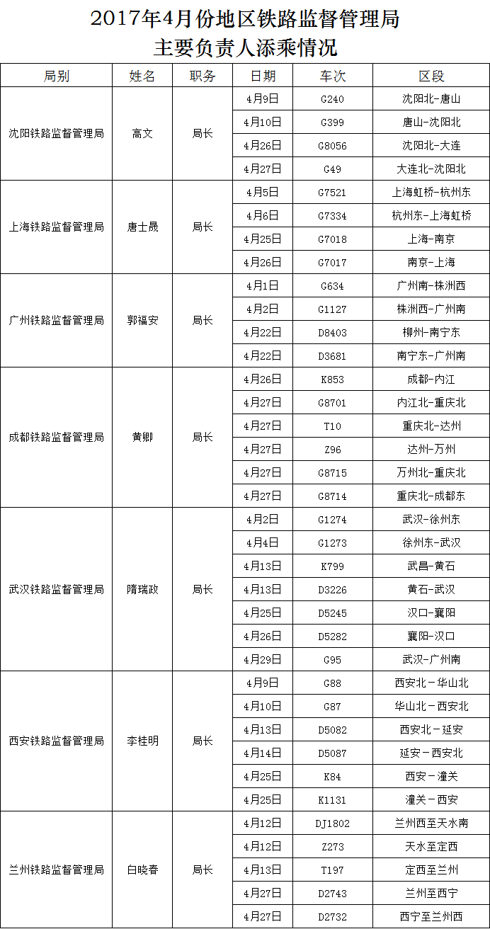 上一篇:2017年4月份地區鐵路監督管理局主要負責人添乘情況