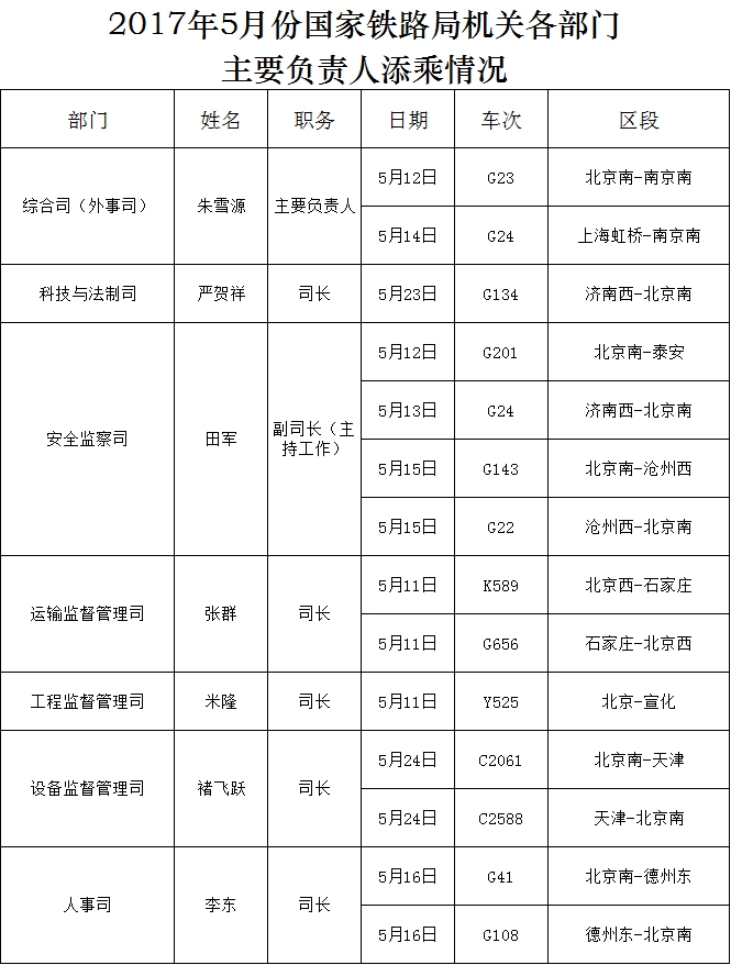 上一篇:2017年5月份國家鐵路局機關各部門主要負責人添乘情況