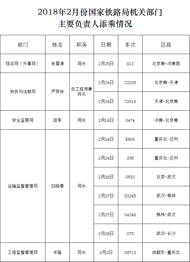 下一篇:2018年2月份國家鐵路局機(jī)關(guān)部門主要負(fù)責(zé)人添乘情況