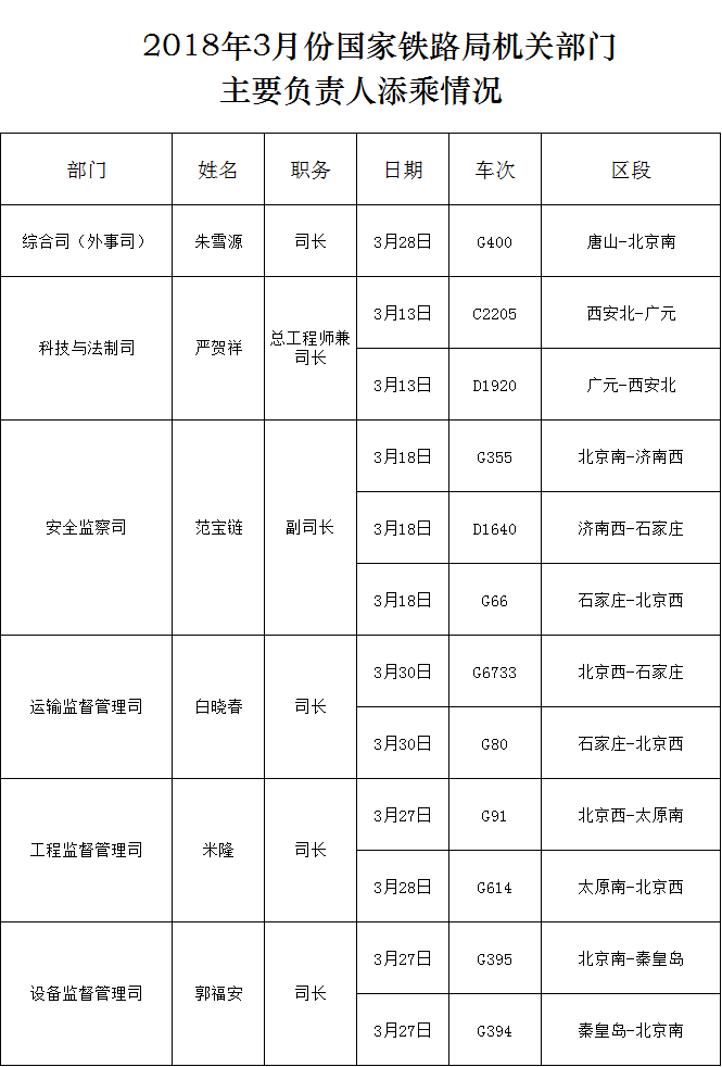 2018年3月份國家鐵路局機關部門主要負責人添乘情況