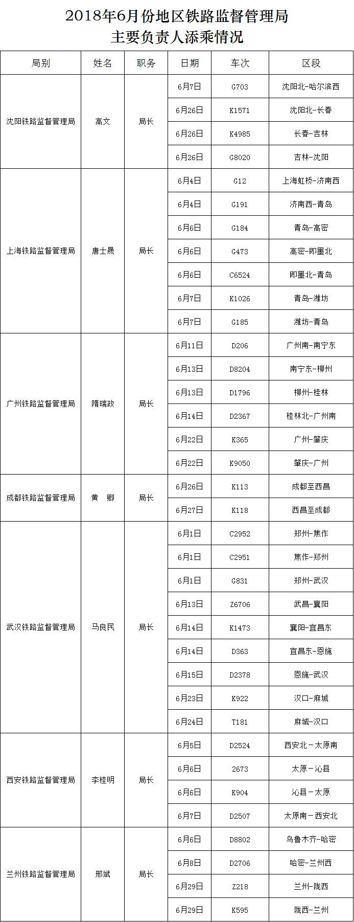 下一篇:2018年6月份地區(qū)鐵路監(jiān)督管理局主要負(fù)責(zé)人添乘情況