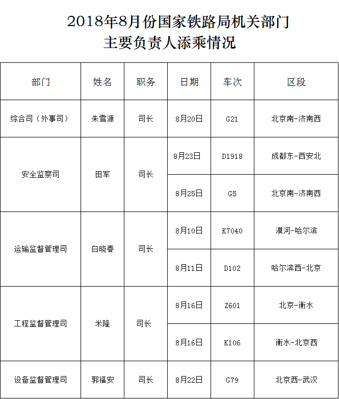 2018年8月份國家鐵路局機關部門主要負責人添乘情況