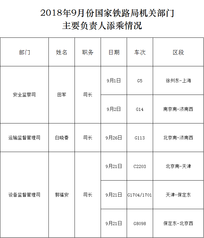 下一篇:2018年9月份國家鐵路局機(jī)關(guān)部門主要負(fù)責(zé)人添乘情況
