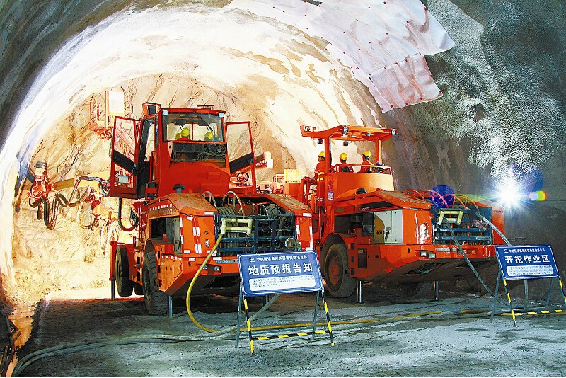 中鐵隧道集團員工在懷邵衡鐵路南雪峰山隧道內利用三臂液壓鑿巖臺車開展開挖作業。王良雷 攝