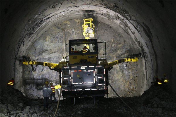 京張高速鐵路八達嶺隧道內三臂鑿巖車施工作業