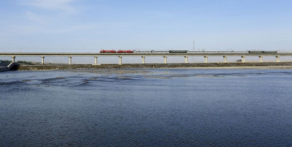 一列蘭新高鐵列車在甘肅張掖黑河大橋上行駛。