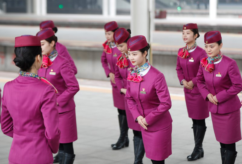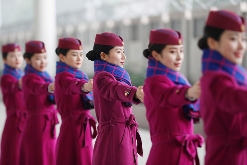 乘務人員在進行彎腰姿勢禮儀培訓。