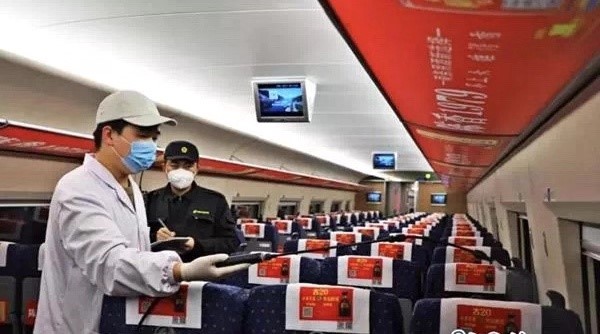 圖為工作人員正在對(duì)列車進(jìn)行全方位消毒。