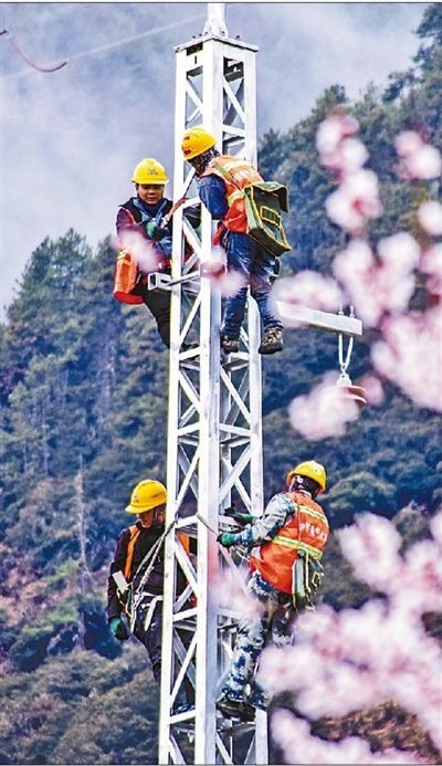 4月2日,中鐵電氣化局集團的建設者在拉林鐵路林芝至崗嘎區間進行棘輪框架安裝。徐馭堯 王寶成攝影報道