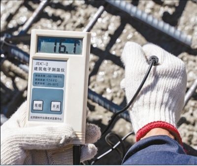 5月9日,中鐵十一局拉林鐵路朗縣制梁場的制梁施工現場,澆筑混凝土測溫工作正在進行。袁泉 崔金鳳攝影報道