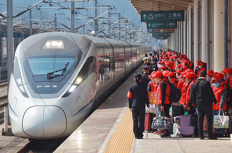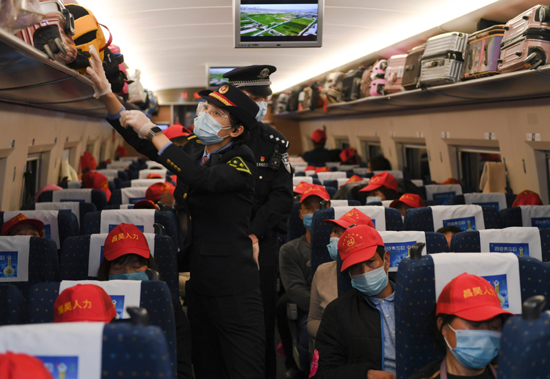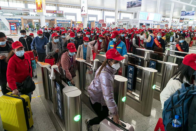 2月20日,500余名貴州省黔東南苗族侗族自治州錦屏縣務工人員在三穗站搭乘2021年貴州首趟務工專列G2336次列車前往浙江義烏。
