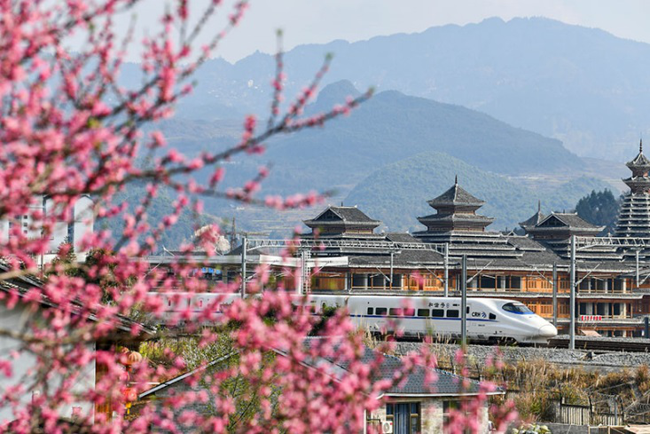 早春時節,貴州省黔東南苗族侗族自治州境內的油菜花、桃花、櫻花次第盛開,動車組列車穿行其間,一路繁花,美不勝收。