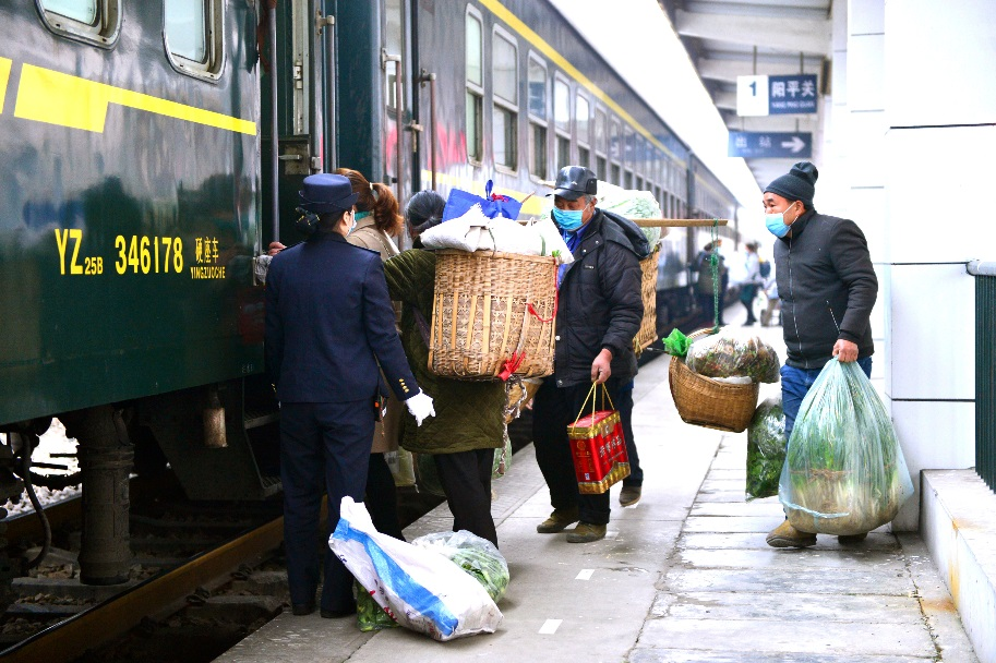 趙明英所在的“惠農(nóng)車廂”,四壁掛滿了沿線各種土特產(chǎn)的照片和介紹,是6063/4次列車的一道特殊風景。列車途經(jīng)13個車站,其中不少是日均客流量不足2000人卻是山民唯一遠行出口的四等小站。一邊是山里人要討生活,一邊是城里人想嘗鮮,中國鐵路西安局集團有限公司一拍板:“搭橋!”按鐵路規(guī)定,超過25公斤的包裹行李需交運費,考慮到老鄉(xiāng)們都生活在集中連片特困地區(qū),西安局再拍板:“全免!”