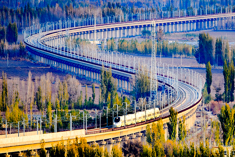 蘭新高鐵動車組列車在新疆哈密特大橋上行駛(2015年11月3日攝)。蘭新高鐵(蘭州至烏魯木齊)是世界上一次性建設里程最長的高速鐵路。