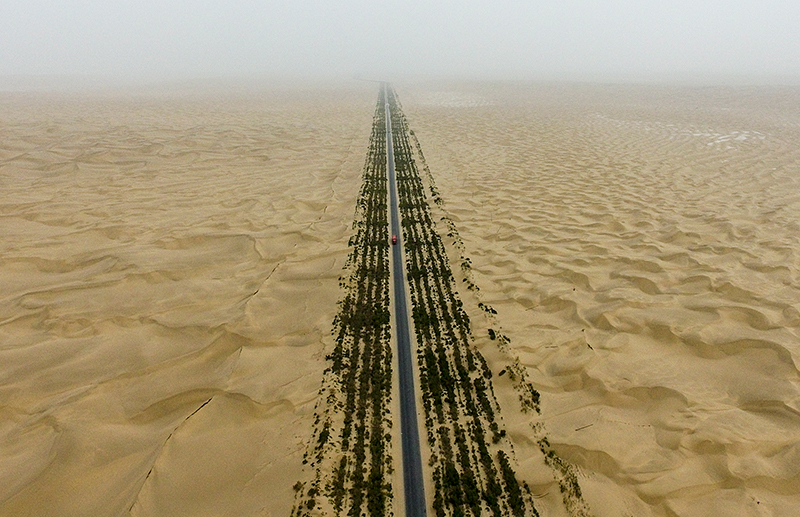汽車行駛在新疆塔克拉瑪干第一條沙漠公路上(2018年6月12日攝,無人機照片)。1995年,全長522公里的首條塔克拉瑪干沙漠公路全線通車,打通了南疆經濟社會發展和塔里木油氣資源勘探開發的交通命脈。