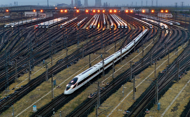 一列復興號動車組列車駛出天津動車所停車場(2019年4月9日攝,無人機照片)。