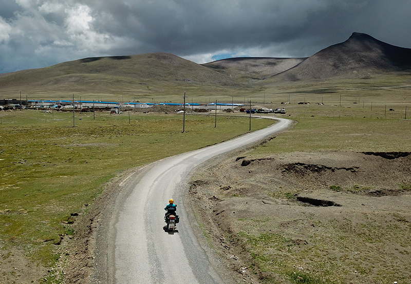 西藏山南市浪卡子縣普瑪江塘鄉郵政投遞員格桑次仁騎摩托車投遞郵件,經過長途跋涉后,海拔5500米的沙空村出現在前方(2018年7月27日攝,無人機照片)。