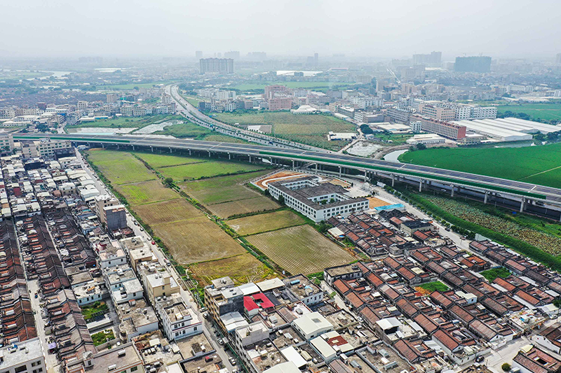 現代化的汕揭高速(廣東汕頭到揭西)與古老的潮汕傳統民居(2020年9月29日攝,無人機照片)。