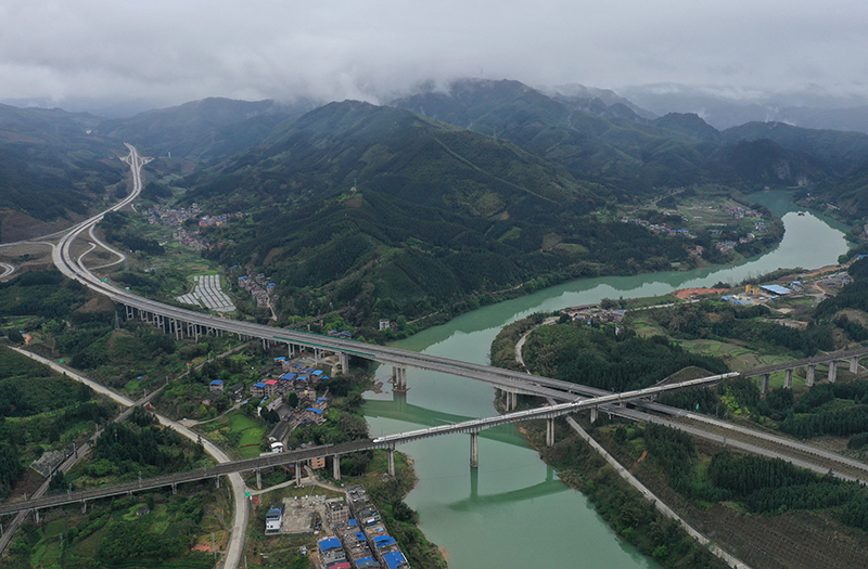廣西三江侗族自治縣的水路、公路、鐵路立體交通網絡(2021年3月20日攝,無人機照片)。