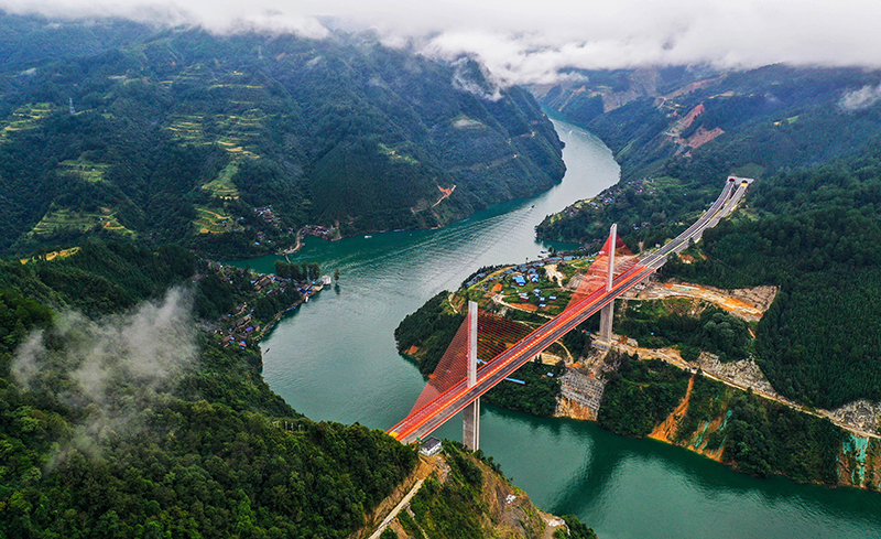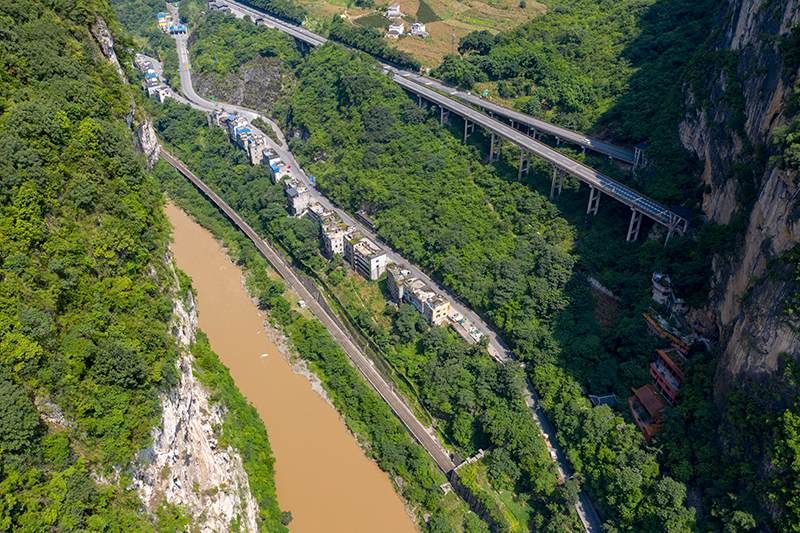 在云南昭通市鹽津縣豆沙鎮,從空中俯瞰“五道并行”,從江邊算起,一眼可見關河水道、內昆鐵路、G247公路、五尺道和渝昆高速五道并行(2020年8月10日攝,無人機全景照片)。