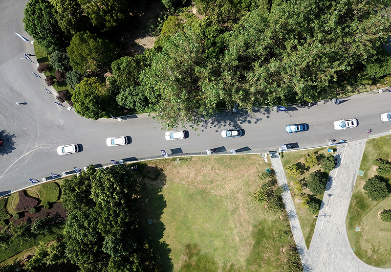 在安徽省合肥市,自動駕駛車輛準備駛入5G示范線(2020年9月3日攝,無人機照片)。當日,安徽省首條自動駕駛汽車5G示范線在合肥市包河區正式開通。