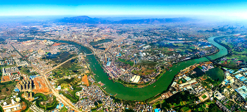 西江黃金水道上的廣西貴港市全景(2018年3月9日攝,無人機照片)。