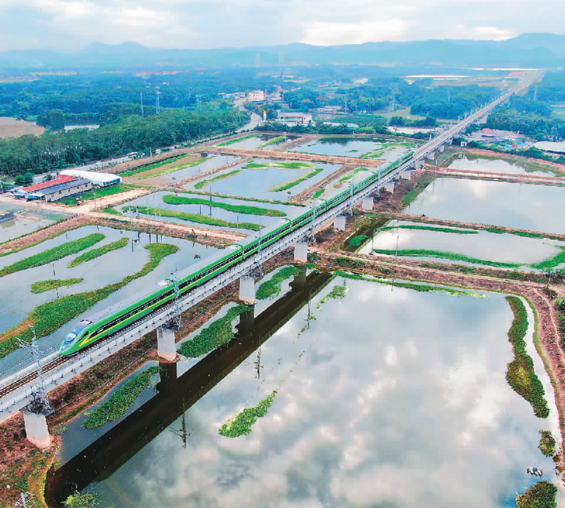 “復(fù)興號”列車行駛在云南省景洪市境內(nèi)的中老鐵路橄欖壩特大橋上。
