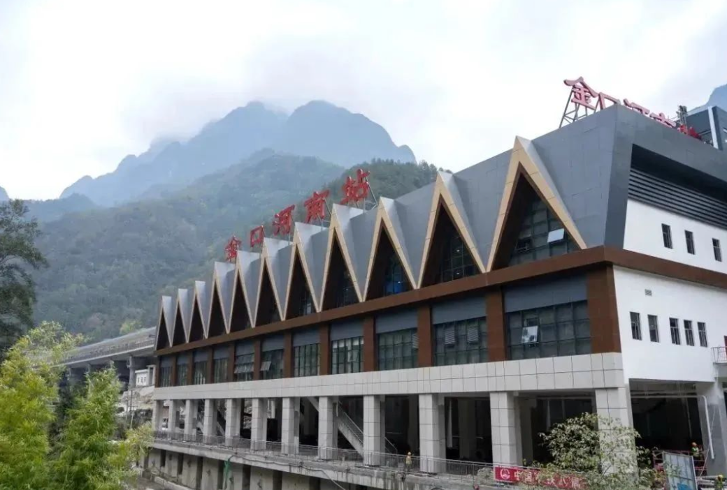 金口河南站位于樂山市金口河區(qū)共安彝族鄉(xiāng)象鼻村。站房輪廓結(jié)合當?shù)匚《氲纳焦仍卦O(shè)計,建筑色彩從當?shù)匾妥鍌鹘y(tǒng)服飾提煉而來,彰顯地域文化。