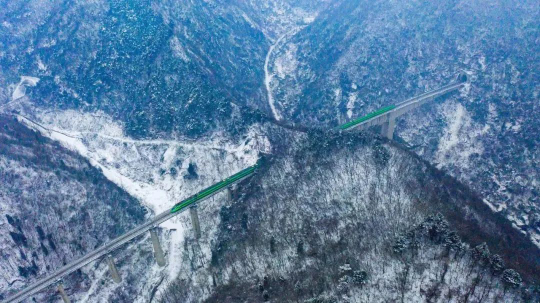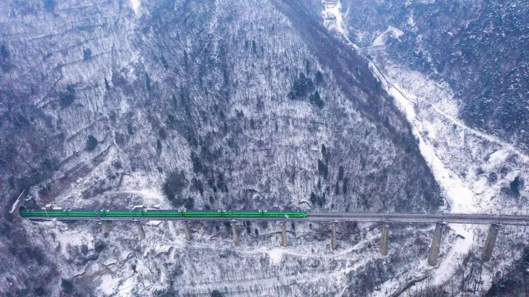 一輛復(fù)興號(hào)動(dòng)集動(dòng)車(chē)組行駛在西康線(xiàn)終南山景區(qū)石砭峪大橋上。