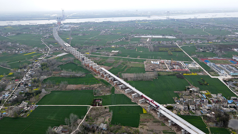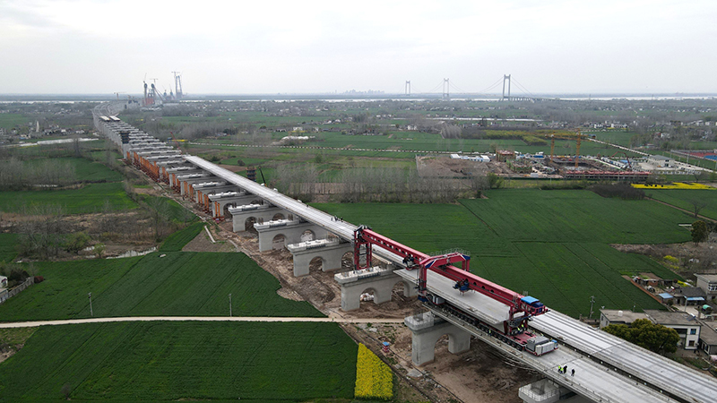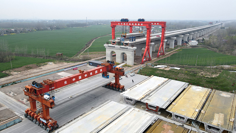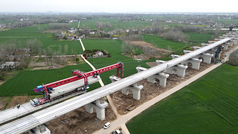 開春以來,位于安徽省馬鞍山市的中鐵四局巢馬城際鐵路箱梁架設(shè)現(xiàn)場一派繁忙景象。施工人員搶抓春季有利天氣,開足馬力奮戰(zhàn)在施工一線,確保重點工程建設(shè)進度。圖為巢馬城際鐵路箱梁架設(shè)現(xiàn)場。