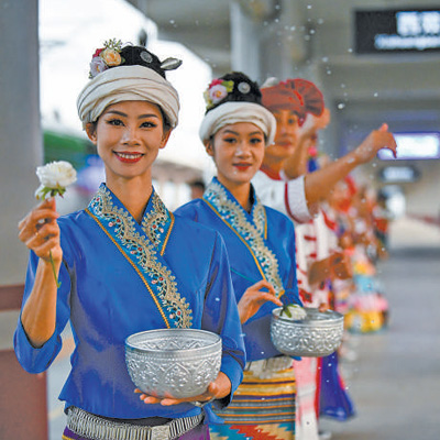 4月13日,在中老鐵路中國西雙版納站,工作人員歡迎乘坐西雙版納至瑯勃拉邦首發列車的旅客。