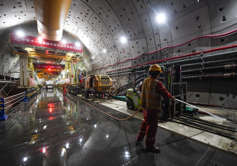 工人在位于四川省成都市的成渝中線高鐵蜀安隧道進行隧道泵漿作業。
