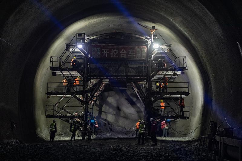 工人在西渝高鐵康渝段北屏隧道掌子面進行施工作業。