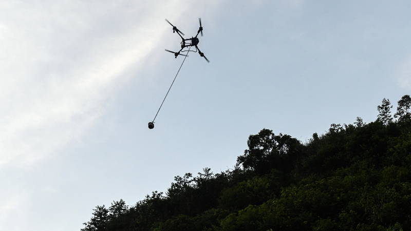 橋隧工人遙控?zé)o人機(jī)給隧道山體上的施工點(diǎn)運(yùn)送混凝土。