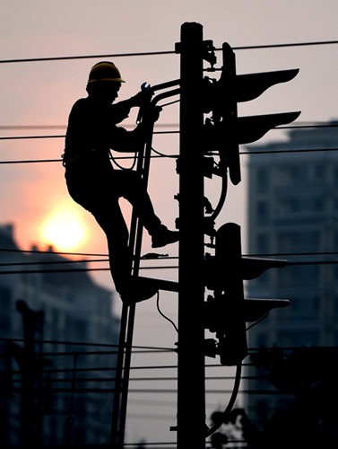 施工人員攀登信號燈桿進行設備調試。