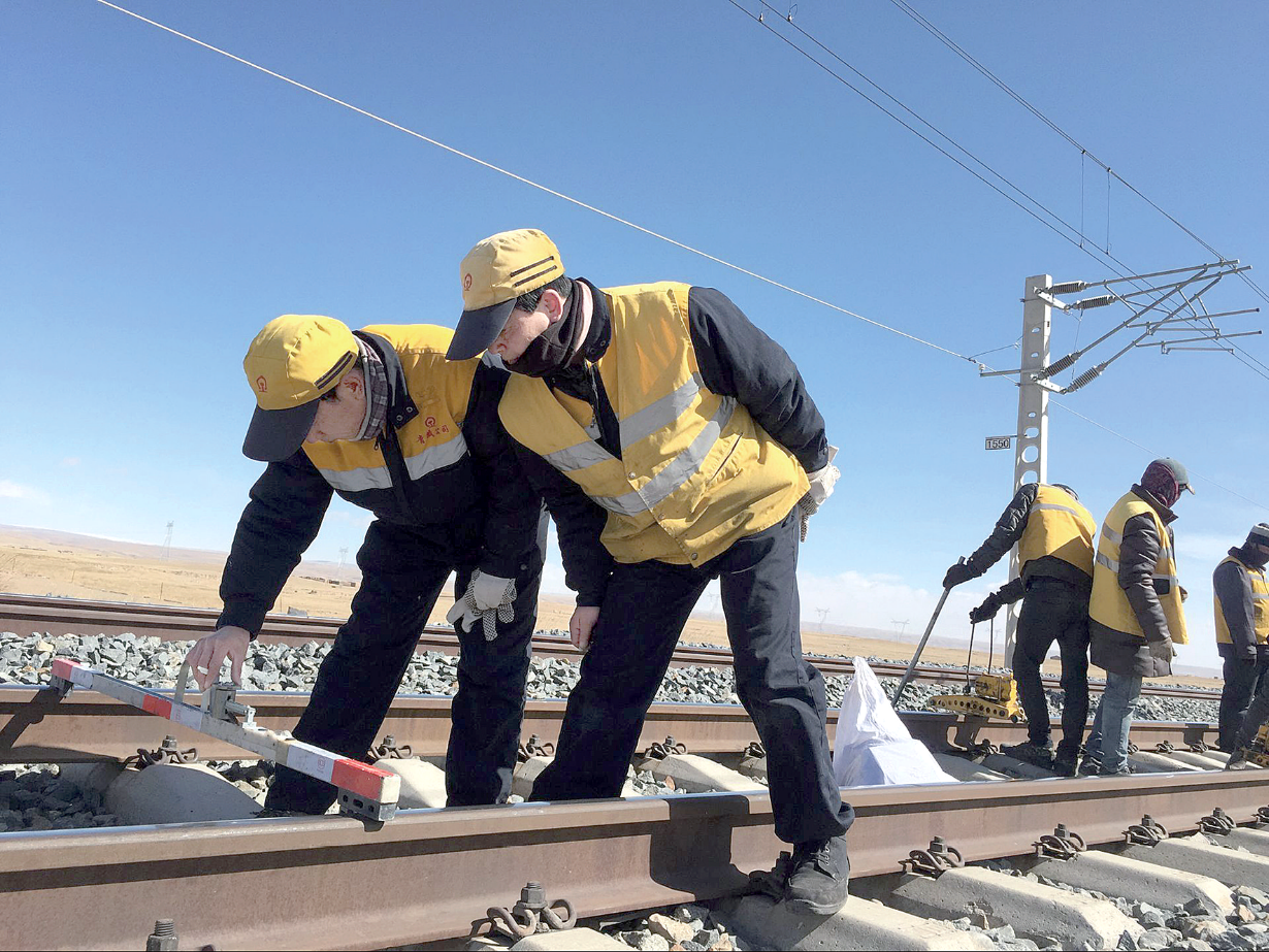 驅(qū)車行駛在曲折蜿蜒的砂石路上,來到海西蒙古族藏族自治州與海北藏族自治州的交界處,記者依稀看到了不遠(yuǎn)處鐵路邊上的工區(qū)房,周邊滿是空曠的草地,耳畔只能聽到呼嘯的寒風(fēng)聲……在青藏鐵路鳥島——天棚鐵路線的區(qū)間內(nèi),記者見到了52歲的張永青和王吉德來,他們手拿道尺正認(rèn)真地對(duì)軌道進(jìn)行著軌距測(cè)量和水平測(cè)量,站著不到半小時(shí),記者的手已凍得僵硬,就是在這樣惡劣的環(huán)境下,張永青和王吉德來每天都要保質(zhì)保量地完成手中的作業(yè),不是一年兩年,一干就是28年。圖為張永青和王吉德正在用道尺測(cè)量軌距。