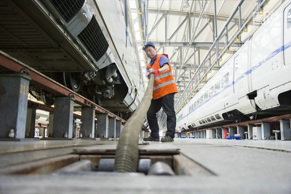 每個動車組有8節車廂,其中7節有集便器,冷玉明清理一節污物箱大概需要3分鐘。平均算下來,冷玉明清潔一組車需要21分鐘,吸污1.75噸。“商務座和一等座旅客比較少,產生的污物不多,清理時間會很短”,冷玉明介紹,節假期出行高峰,列車上座率高,清理完一列動車所有污物就要花半個多小時。