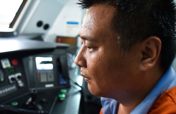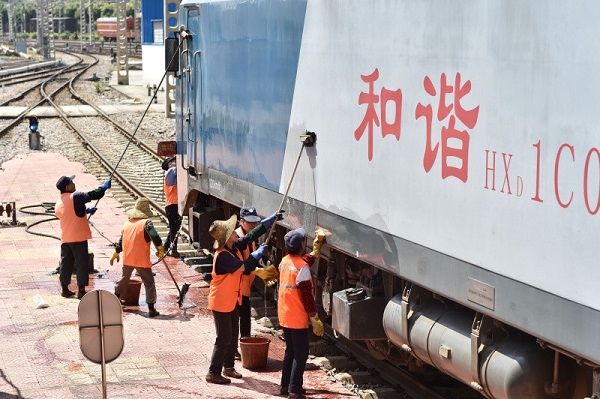 保潔工人在對火車頭進行外部清洗,此時地表溫度超過50攝氏度。