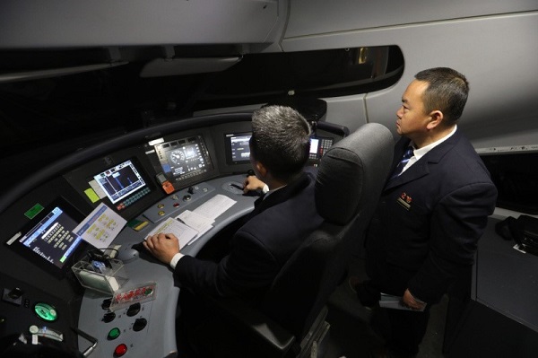 陳輝(右)在DJ8841次動車組駕駛艙內對前方路況進行觀察。