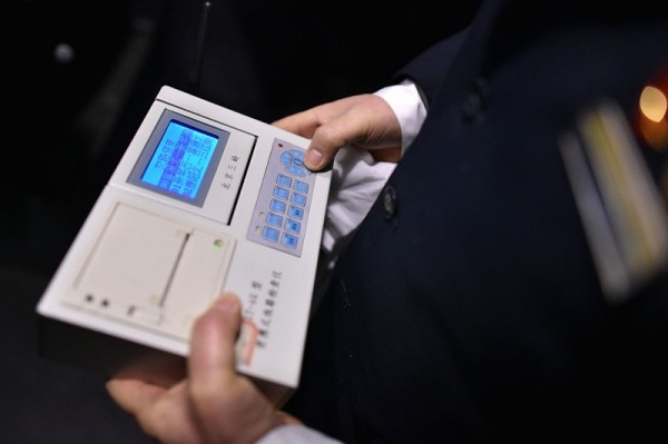 陳輝在DJ8841次動車組駕駛艙內安裝便攜式線路檢查儀。